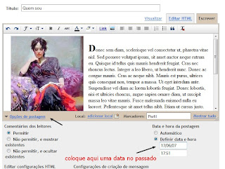 A página do perfil do Blogger não é lá muito charmosa, por isso, você pode criar um post bem caprichado falando de você, seu trabalho, o que for, e fazer com que o gadget Perfil leve o leitor até este post. Primeiro crie o texto falando sobre você e antes de publicar, clique no link Opções de Postagens e programe uma data no passado, para que o post não apareça na primeira página do blog, como mostra a imagem abaixo: